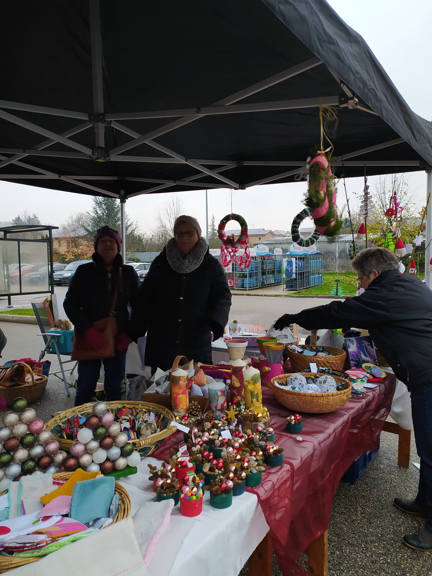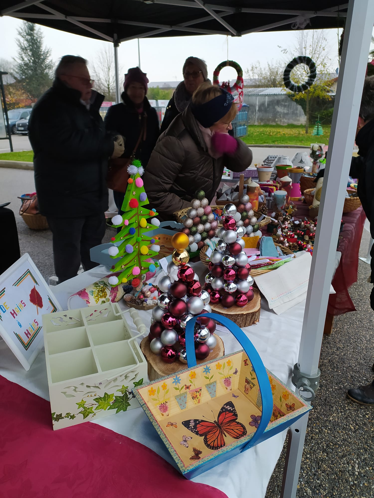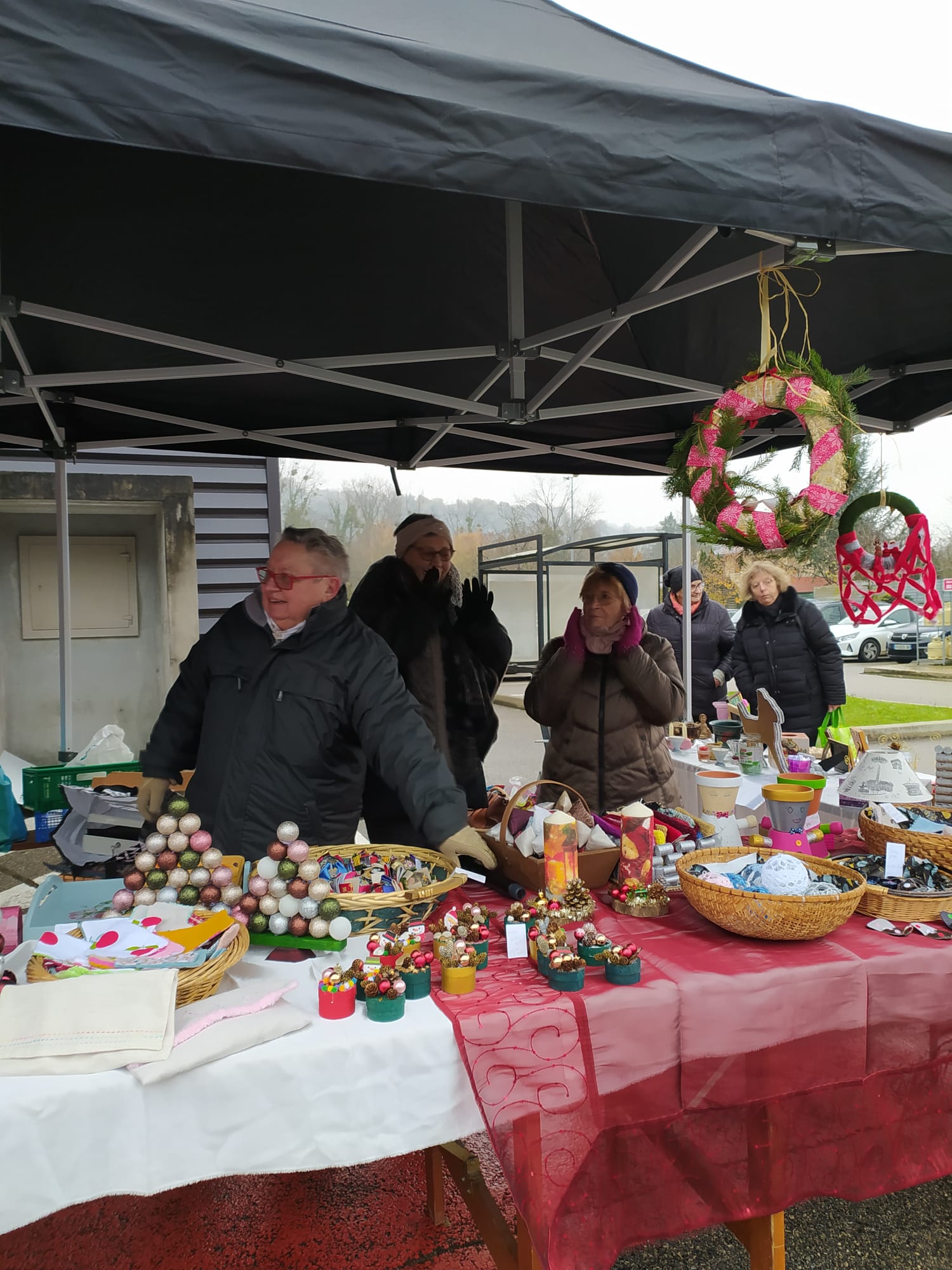 Stand du marché de Noël de l’association De Mains à Mains, devant l’entrée d’Intermarché, en collaboration avec l’association Patrimoine de Neuville, le samedi 10 décembre 2022 : une journée froide mais pleine de chaleur par le partage et les rires qui ont fusé régulièrement.